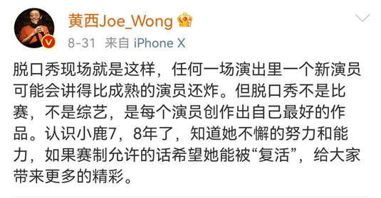 "Xiu’s production process is a downward curve. The effect of a show looks the most beautiful in the text, at the highest point; When going to a performance, especially when guests come to perform, 80% of the effect will be damaged; Then broadcast, even the performance of talk show actors is doomed to screen failure and the effect is discounted. "